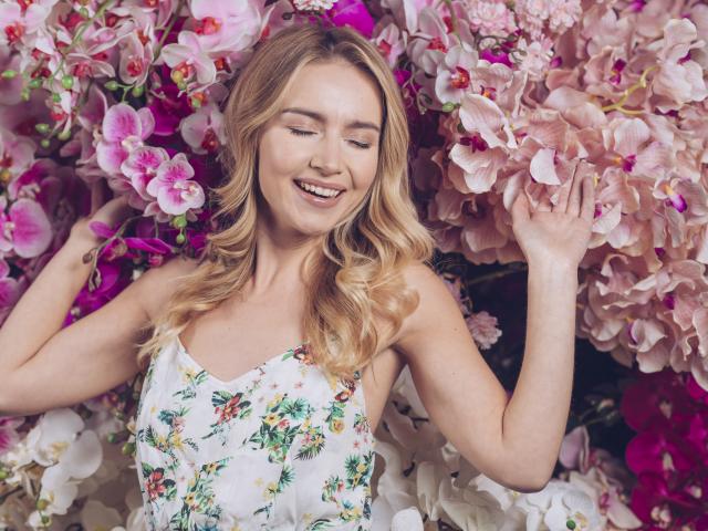 Wallpaper Smiling happy girl near orchid flowers