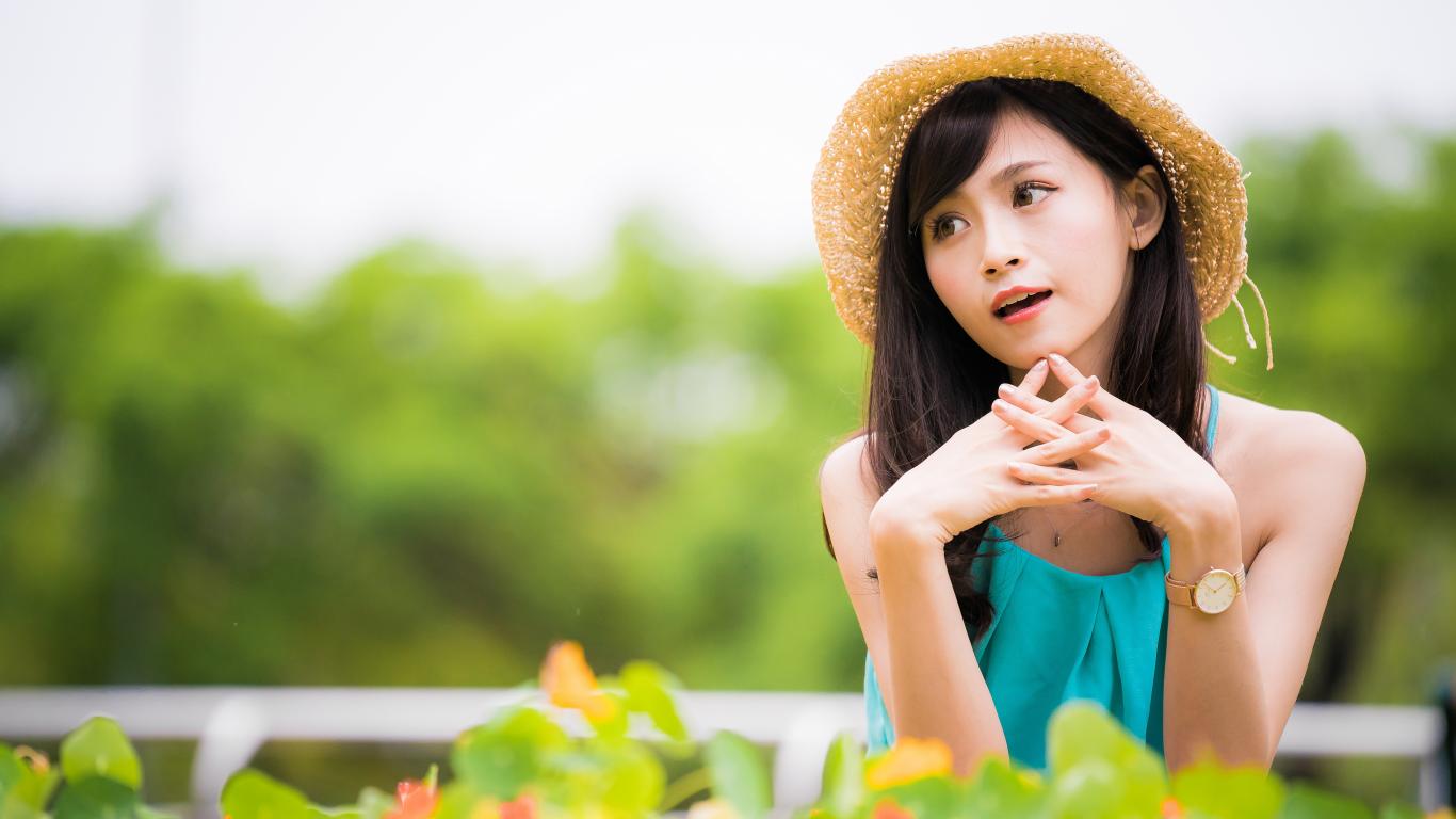 Wallpaper Asian girl with a clock on a hand in a hat