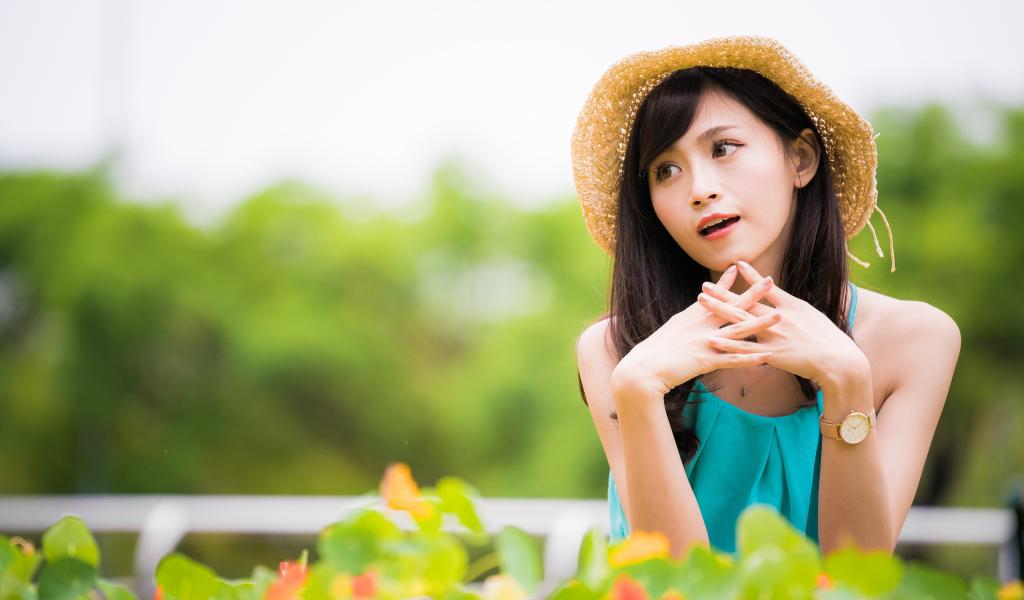 Wallpaper Asian girl with a clock on a hand in a hat
