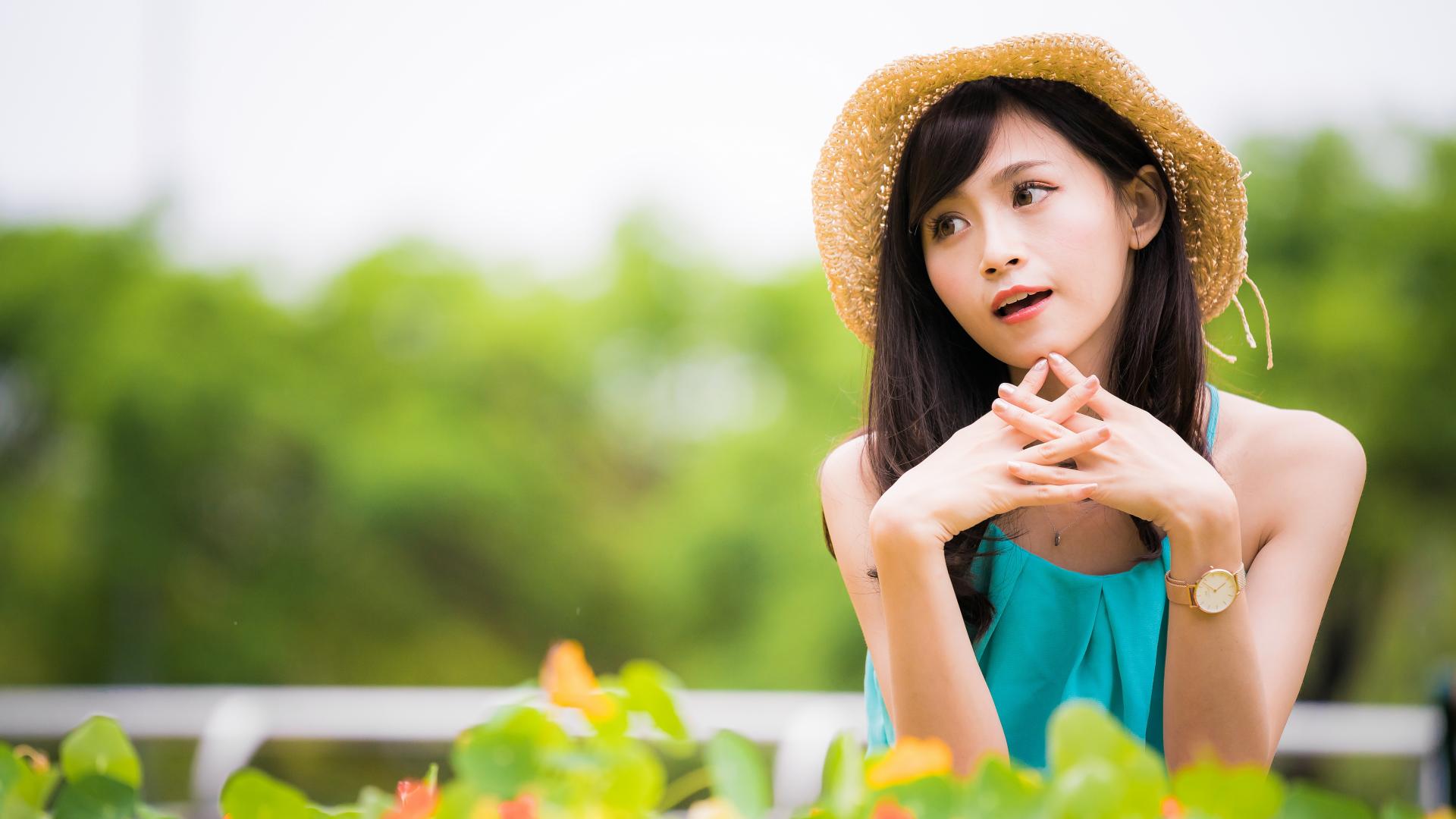Wallpaper Asian girl with a clock on a hand in a hat