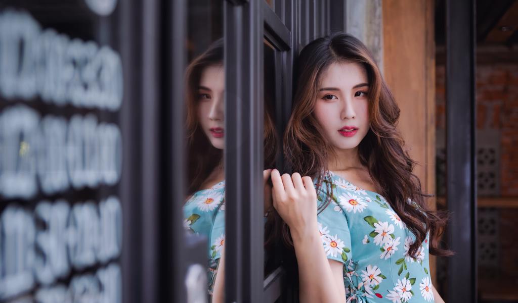 Wallpaper Long-haired Asian girl stands by the window