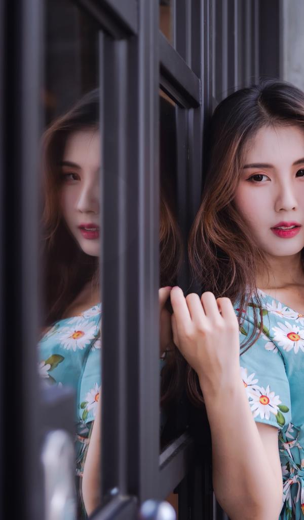Wallpaper Long-haired Asian girl stands by the window