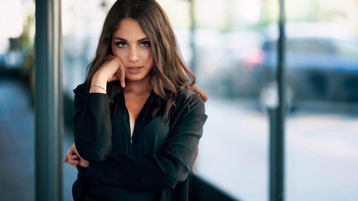 Wallpaper A cute girl in a black outfit stands at a bus stop