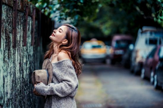 Wallpaper Asian girl in a warm sweater stands at the fence