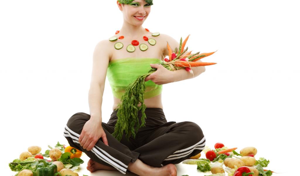 » Wallpaper Vegetarian girl with vegetables on a white background