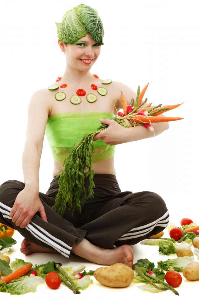 » Wallpaper Vegetarian girl with vegetables on a white background