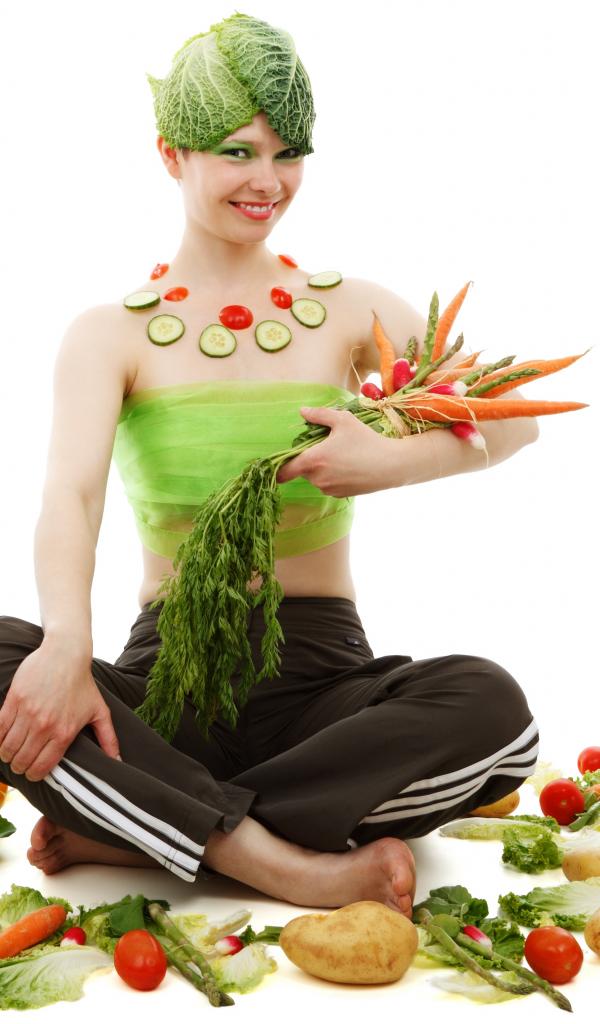 » Wallpaper Vegetarian girl with vegetables on a white background