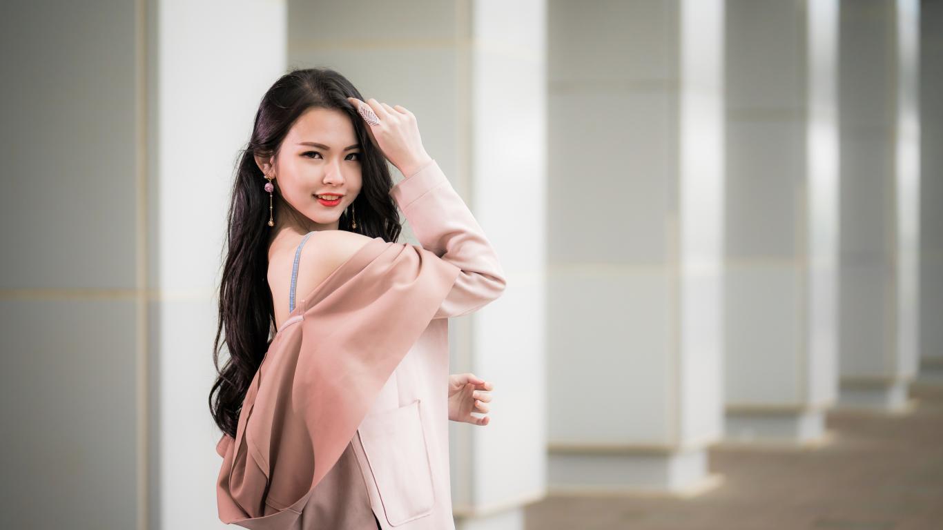 Wallpaper Beautiful Asian girl with long hair in a pink coat