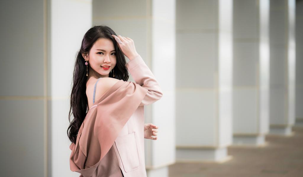 Wallpaper Beautiful Asian girl with long hair in a pink coat