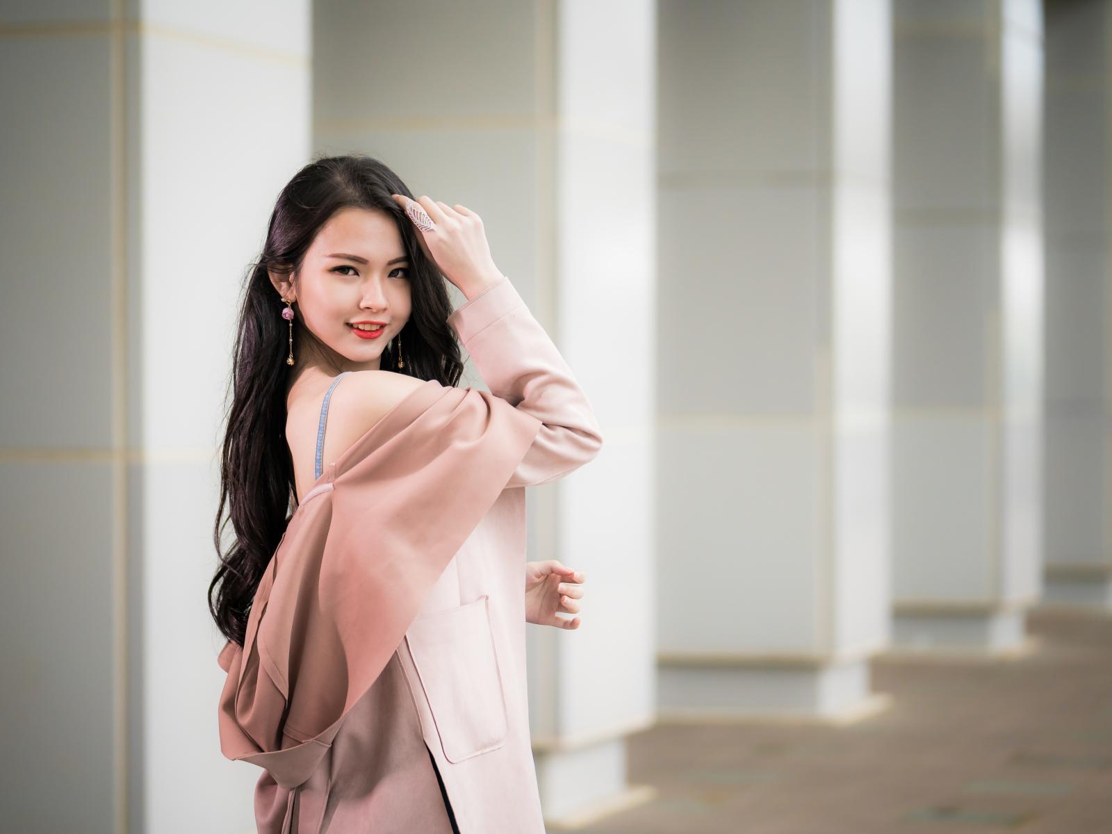 Wallpaper Beautiful Asian girl with long hair in a pink coat