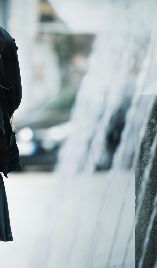 Wallpaper Beautiful girl in a black dress with hands on her head