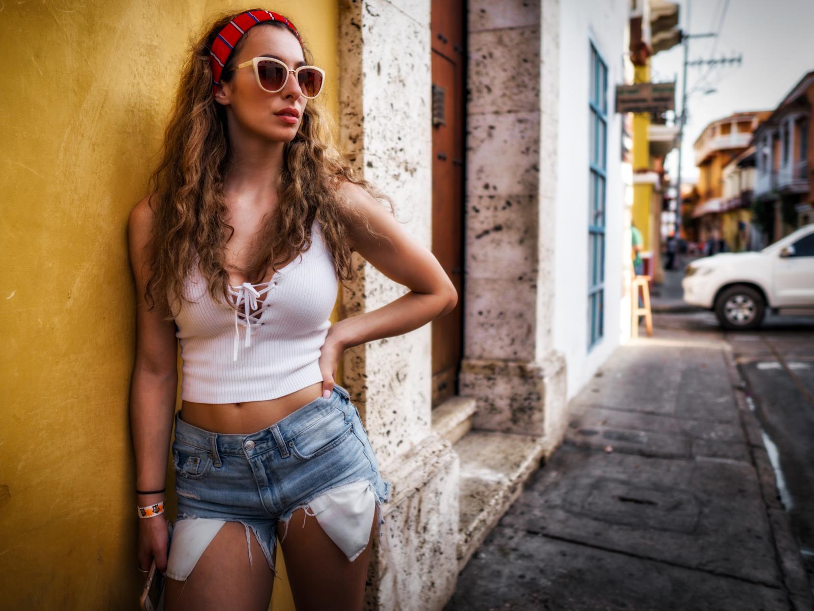 Wallpaper Beautiful girl in sunglasses stands by the wall