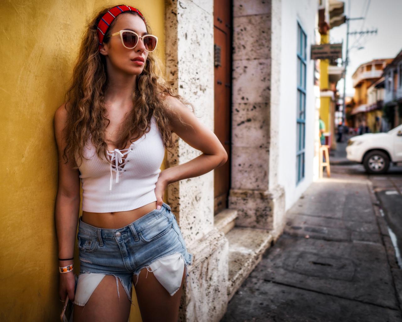 Wallpaper Beautiful girl in sunglasses stands by the wall