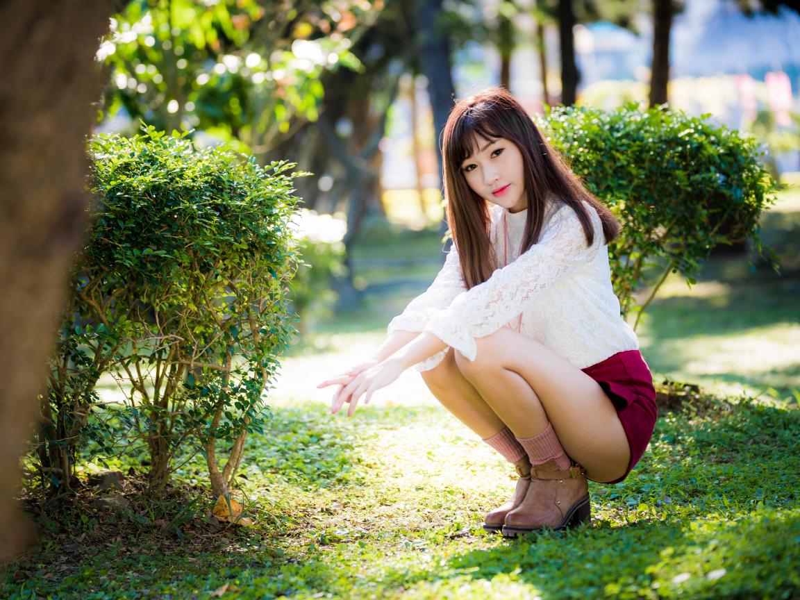 » Wallpaper Asian girl squatting in the park