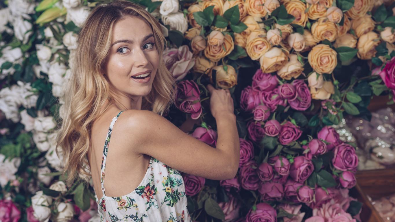 Wallpaper Beautiful blonde on a background of a wall with roses