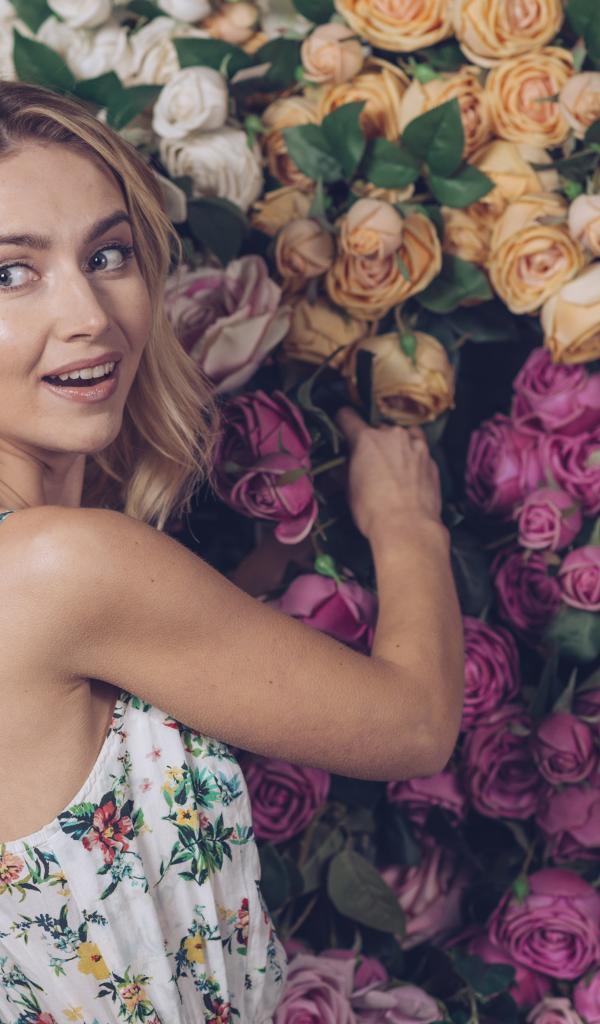 Wallpaper Beautiful blonde on a background of a wall with roses