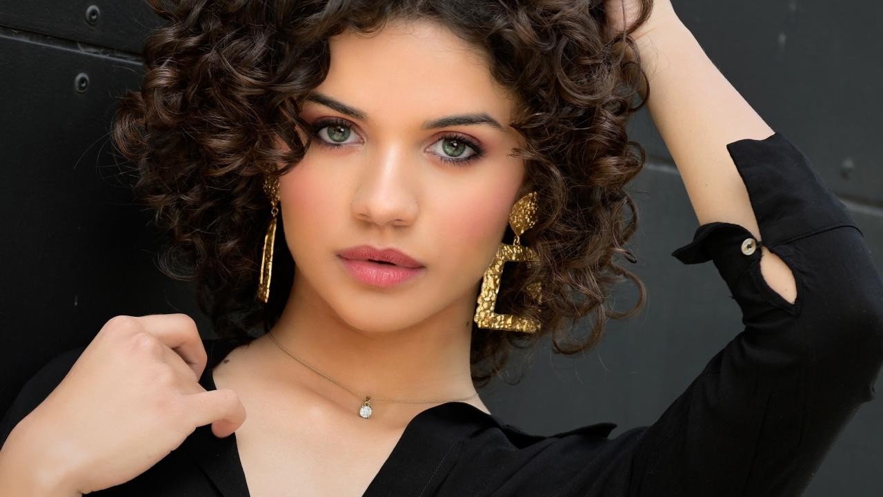 Wallpaper Curly girl with hand in hair in a black shirt