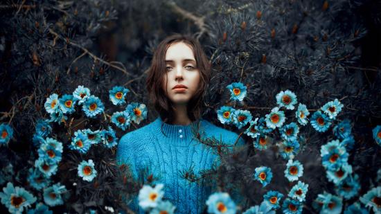 Wallpaper Beautiful girl spiny thickets with blue flowers