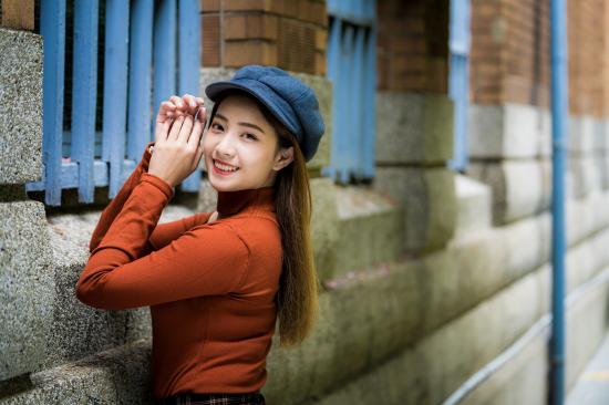 Wallpaper Beautiful Asian girl in a hat stands by the wall