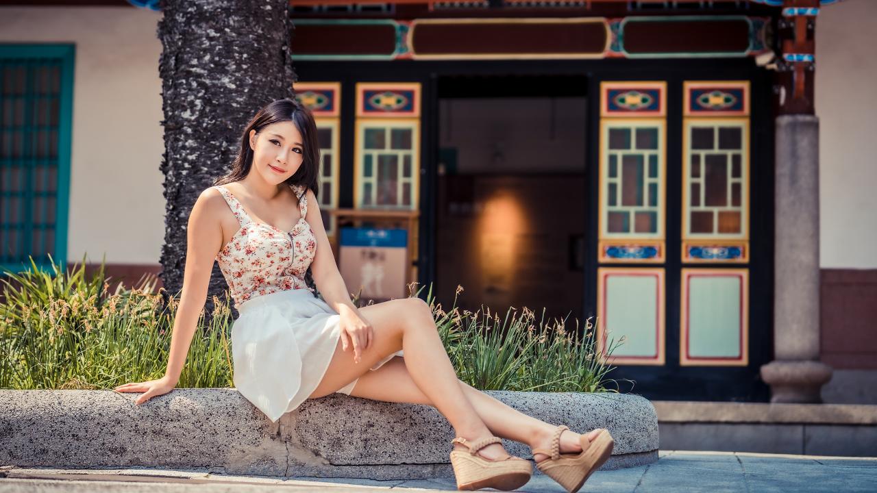 Wallpaper Cute smiling girl sitting on the curb