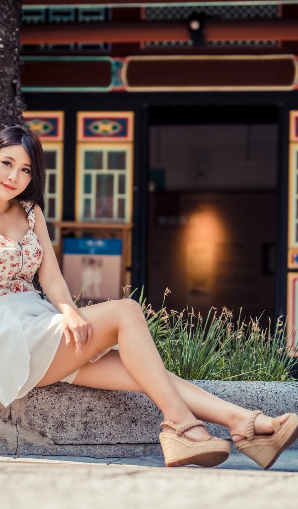 Wallpaper Cute smiling girl sitting on the curb