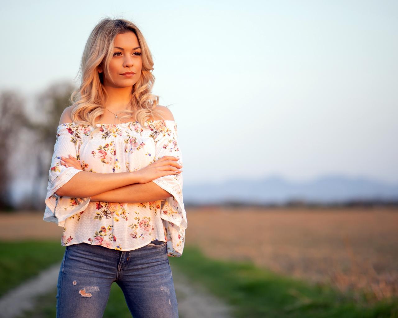 Wallpaper Beautiful blonde girl in jeans in the field