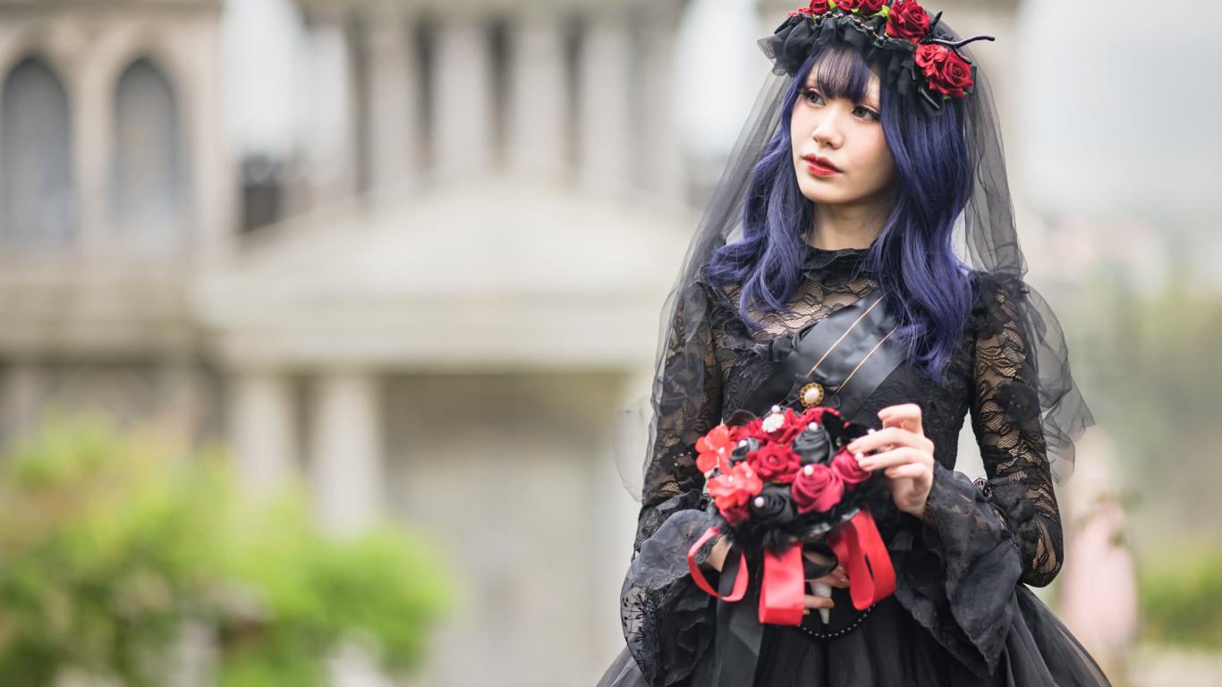 Wallpaper Girl in a black gothic dress with a bouquet of black roses