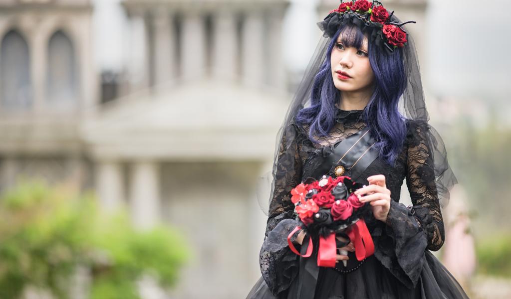 Wallpaper Girl in a black gothic dress with a bouquet of black roses