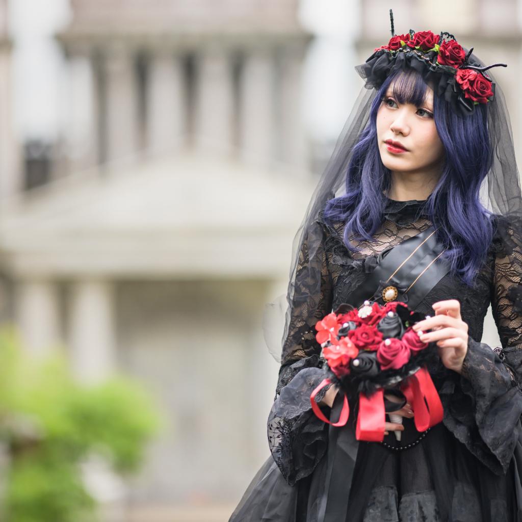 Wallpaper Girl in a black gothic dress with a bouquet of black roses