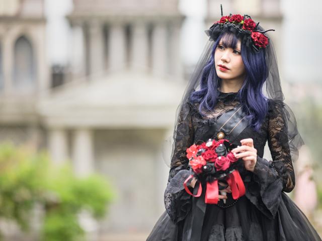 Wallpaper Girl in a black gothic dress with a bouquet of black roses