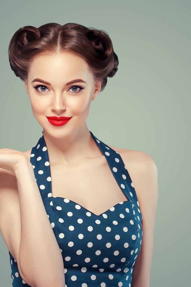 Wallpaper Beautiful girl in polka-dot dress on a gray background