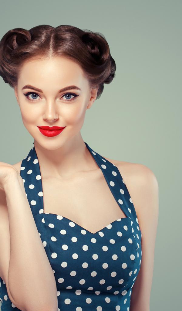 Wallpaper Beautiful girl in polka-dot dress on a gray background