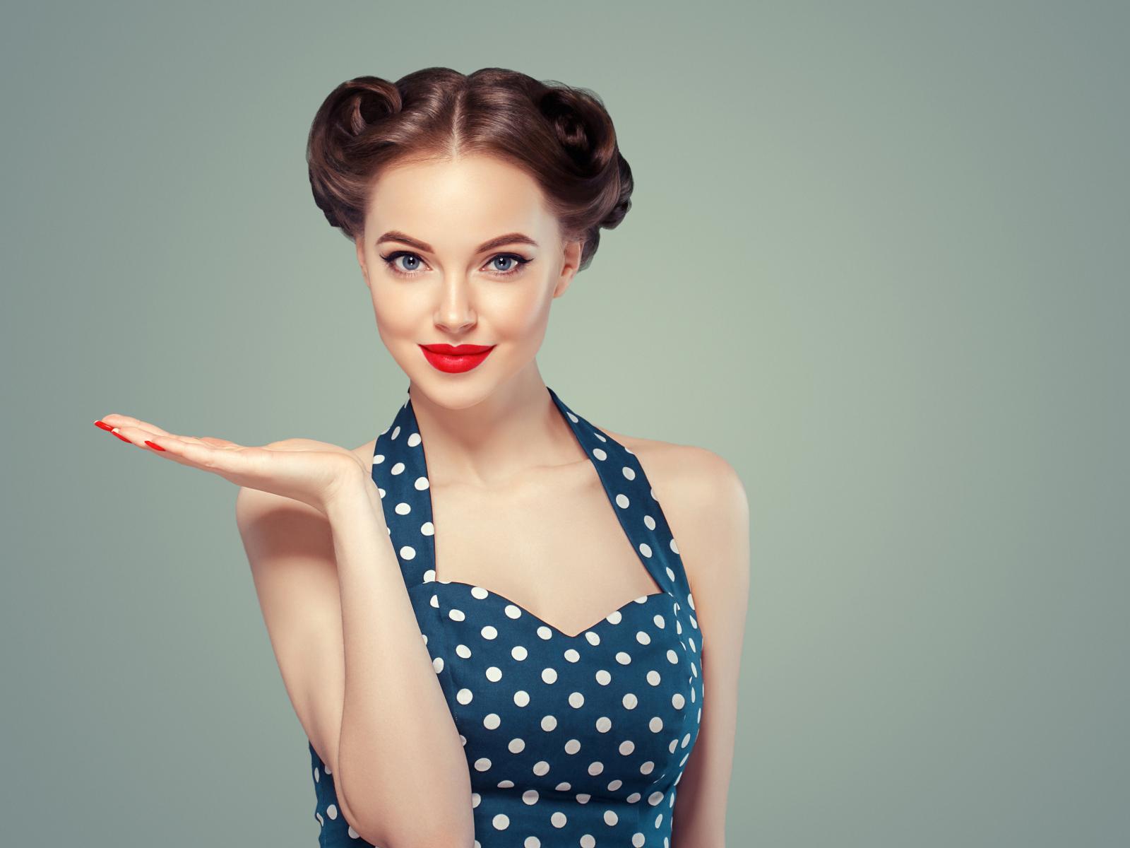 Wallpaper Beautiful girl in polka-dot dress on a gray background