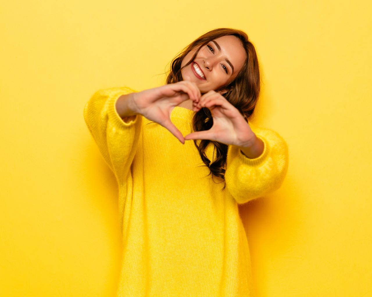 Wallpaper Girl in a yellow sweater shows a heart with her hands