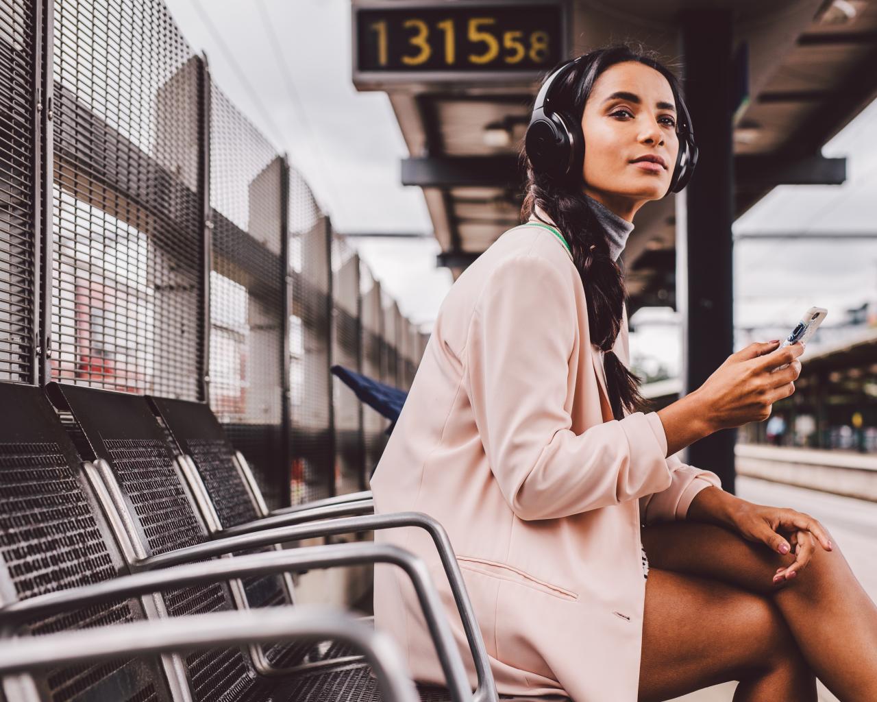 Wallpaper Young girl in headphones sits at a bus stop