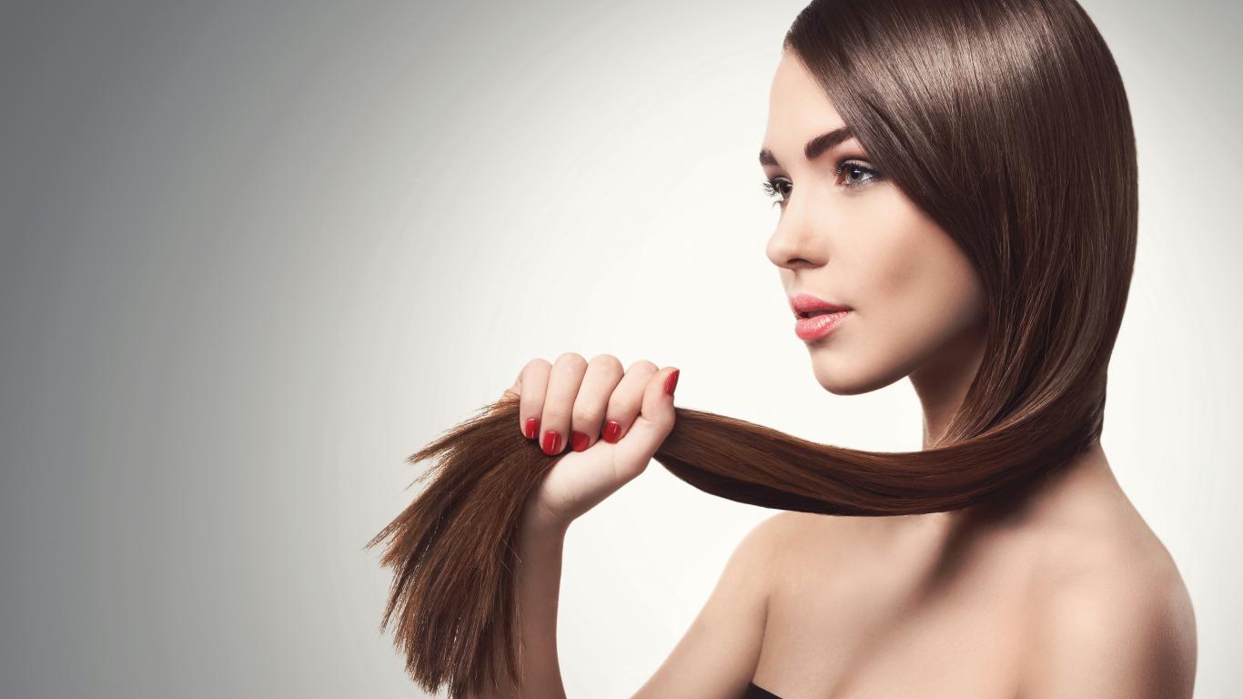 Wallpaper Young girl holding hair in hands on gray background