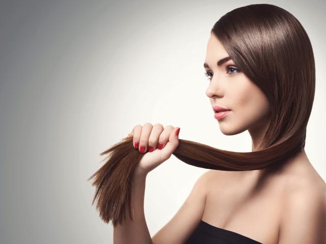 Wallpaper Young girl holding hair in hands on gray background