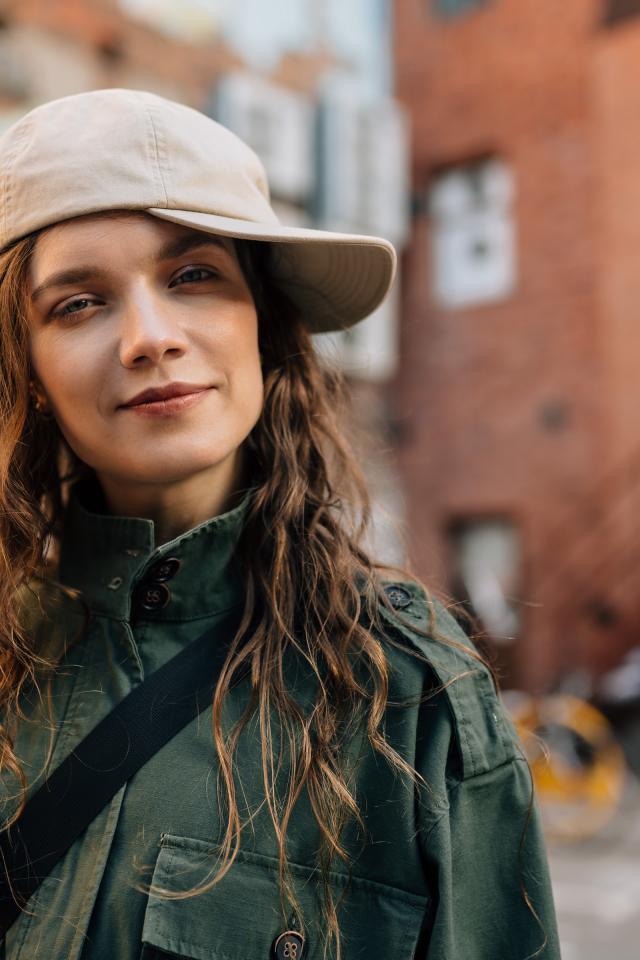 Wallpaper Young fashionable girl in a cap in the city