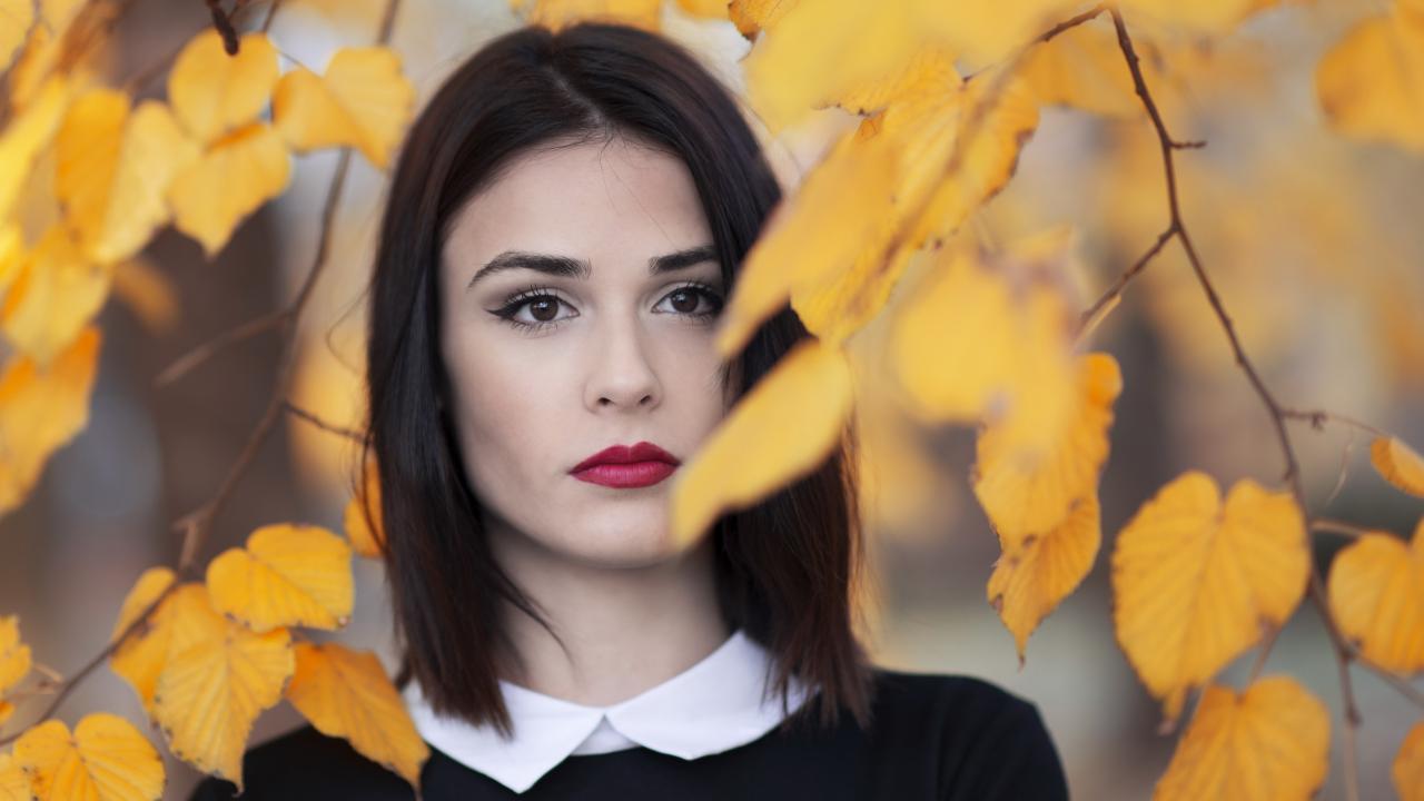 Wallpaper Girl with red lips near a branch with yellow leaves