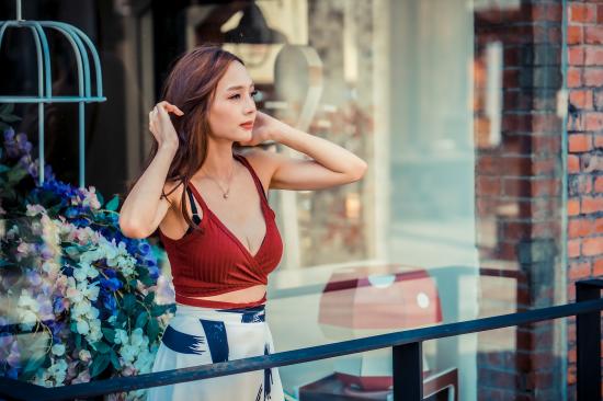 Wallpaper Gentle Asian girl stands on the balcony