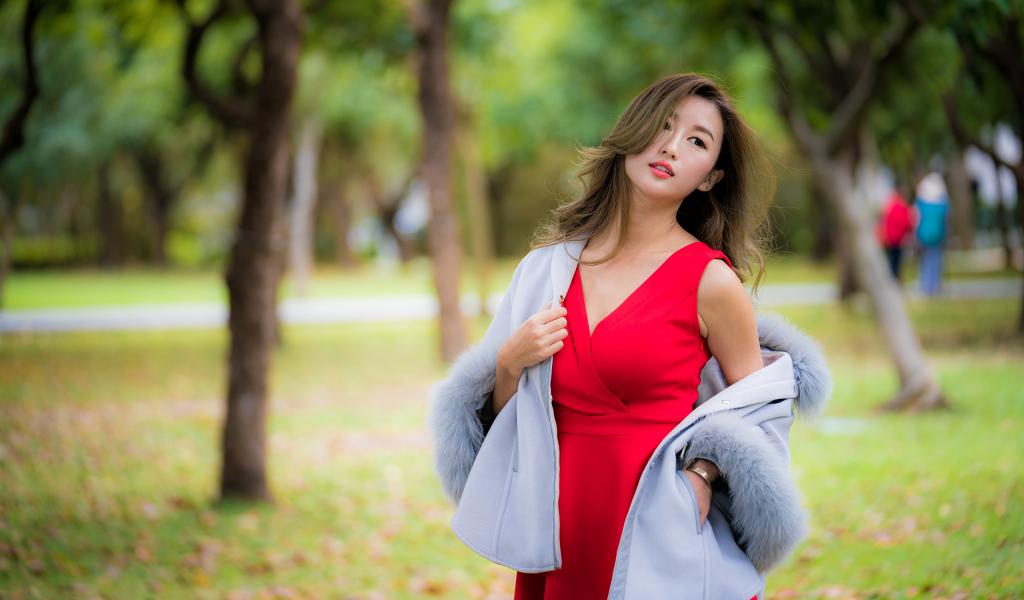 Wallpaper Bright Asian girl in a red dress in the park