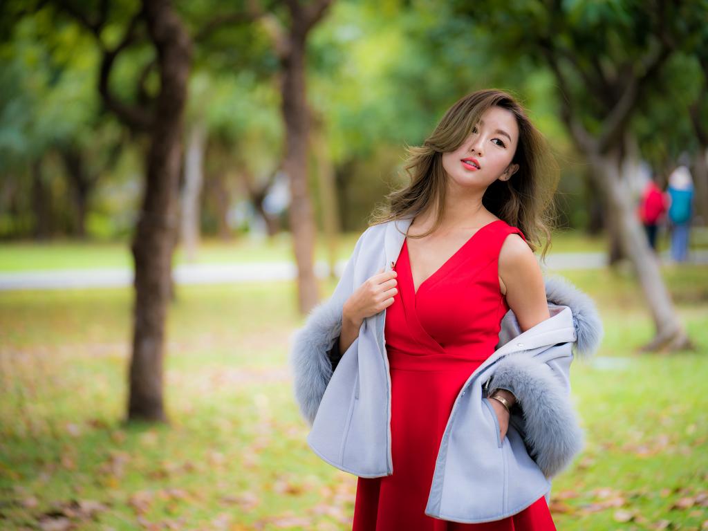 Wallpaper Bright Asian girl in a red dress in the park