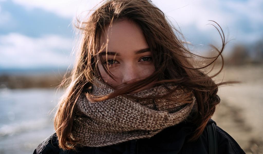 Wallpaper Girl with a warm knitted scarf on her face