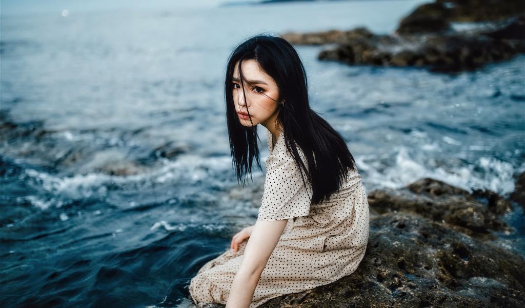 Wallpaper Young Asian girl sitting on a stone by the water