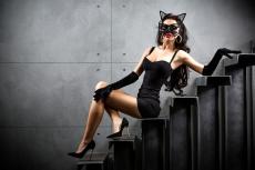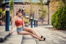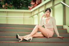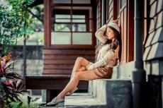 Wallpaper Asian woman in white shirt sits on the steps near the motorcycle