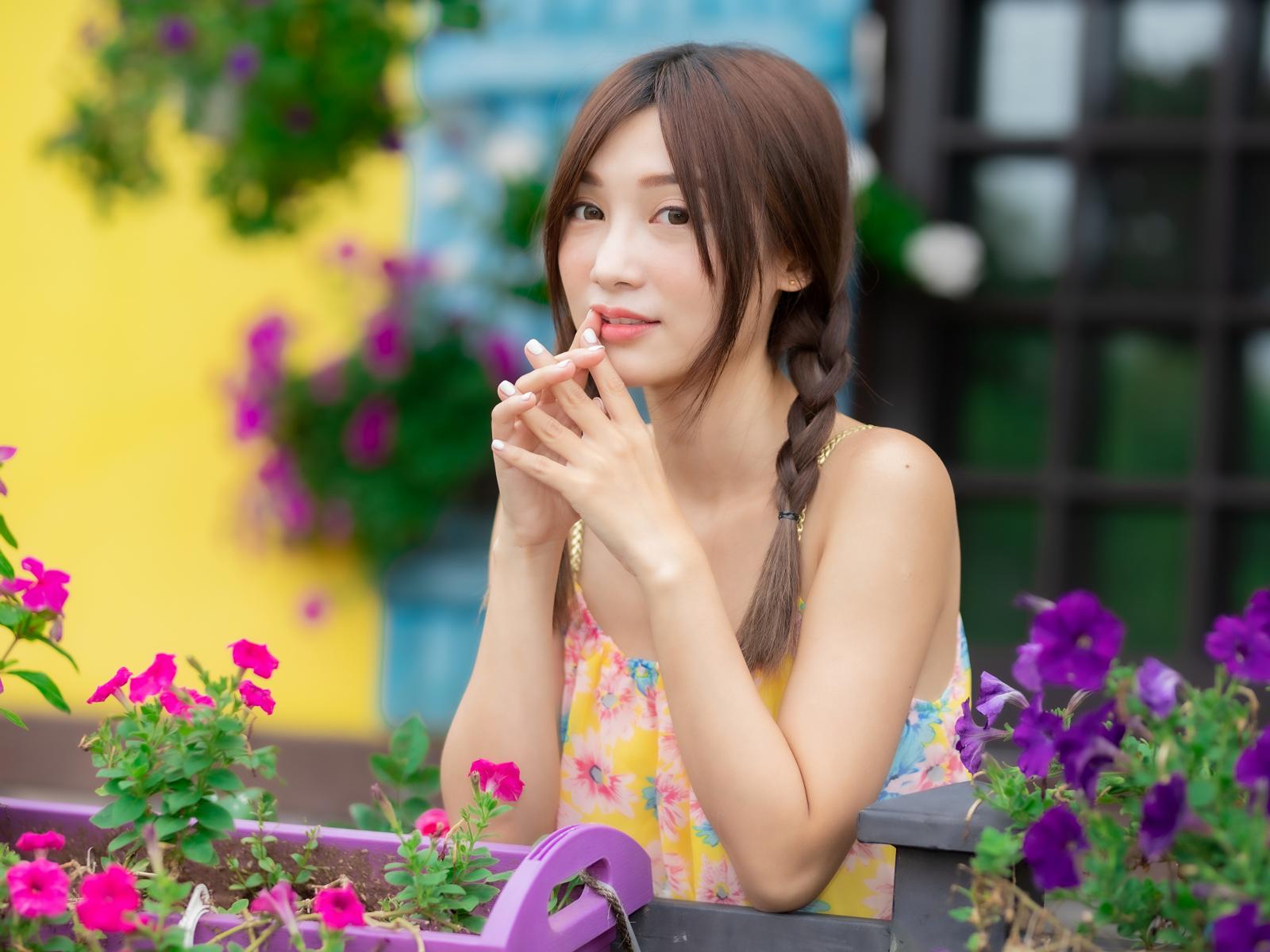 Wallpaper Beautiful Asian girl near petunia flowers