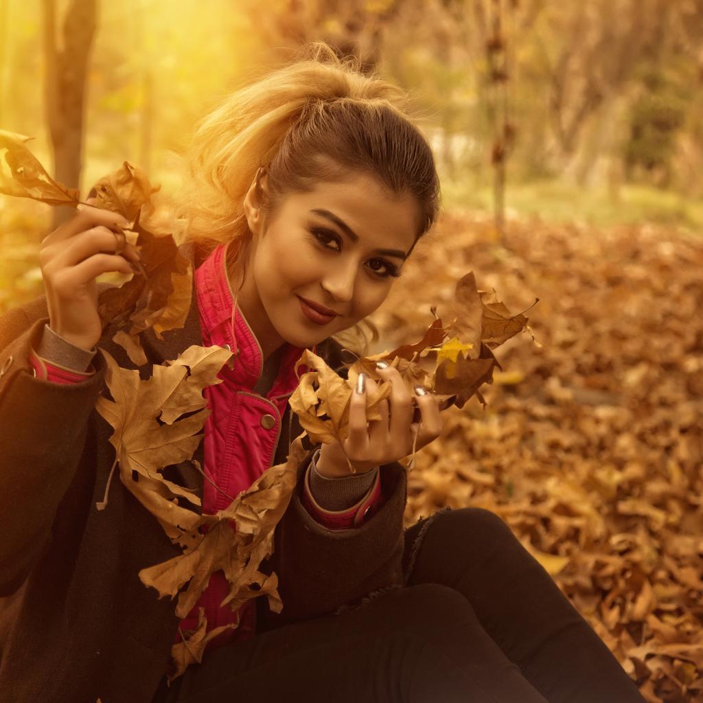 Wallpaper Young girl with fallen leaves in her hands in the park