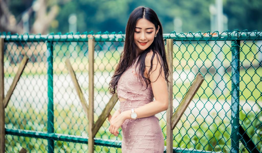 Wallpaper Cute Asian woman in a dress stands under the fence