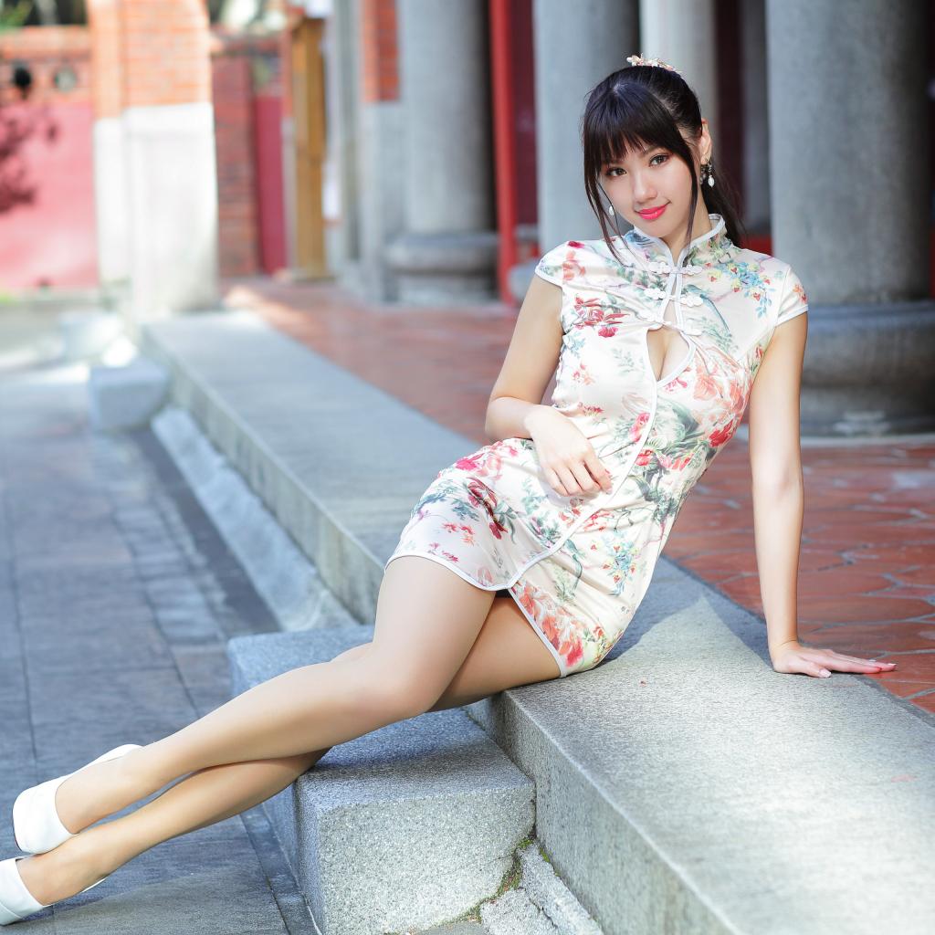 Wallpaper Beautiful asian girl in a dress sits on the steps