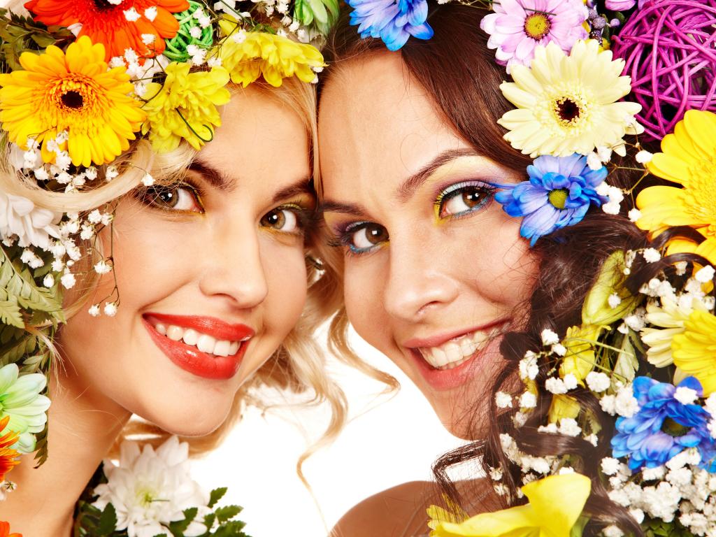Wallpaper Two bright smiling girls with flowers in their hair